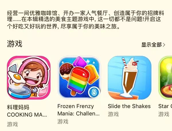 本周一共有130款新游上线,其中15款被App Store推荐至“本周新游”。另外App Store本周还推出了美食游戏专题,展示了《料理妈妈》、《糖果苏打传奇》、《糖点消消乐》等美食题材的游戏。这类贴合大众刚需的题材也是打入儿童和中老年人市场的法宝。