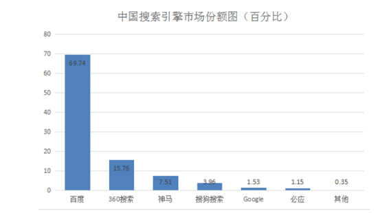 2018年1月,百度中国市场份额为69.74%,排名第一(中国无可置疑的NO:1);